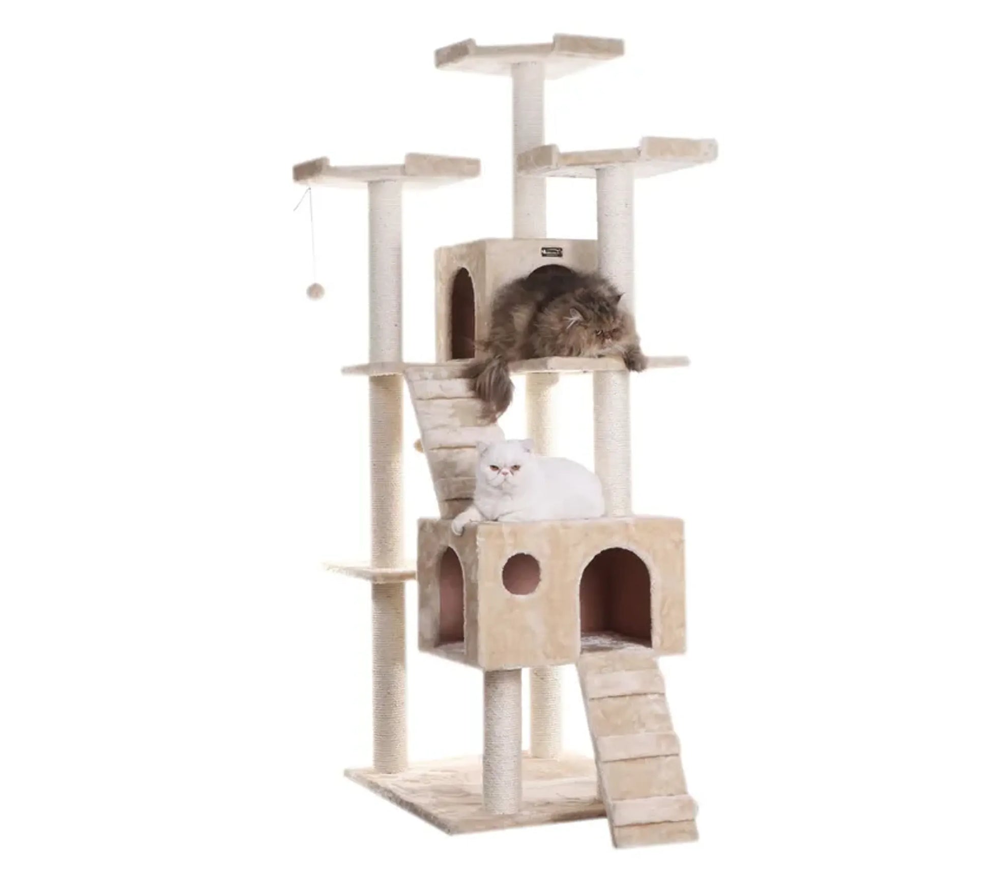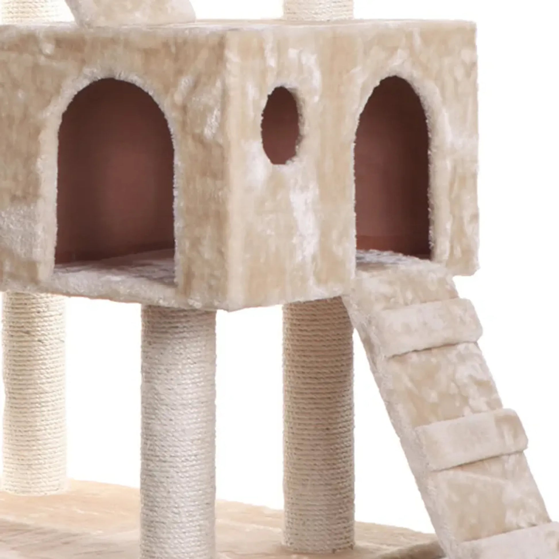 74" height, beige multi-level cat tower, with high density faux fur covering for felines comfort and soft, coverings are permanently adhered to wood structures, gives your cats a soft and conformatable touch in their estate.